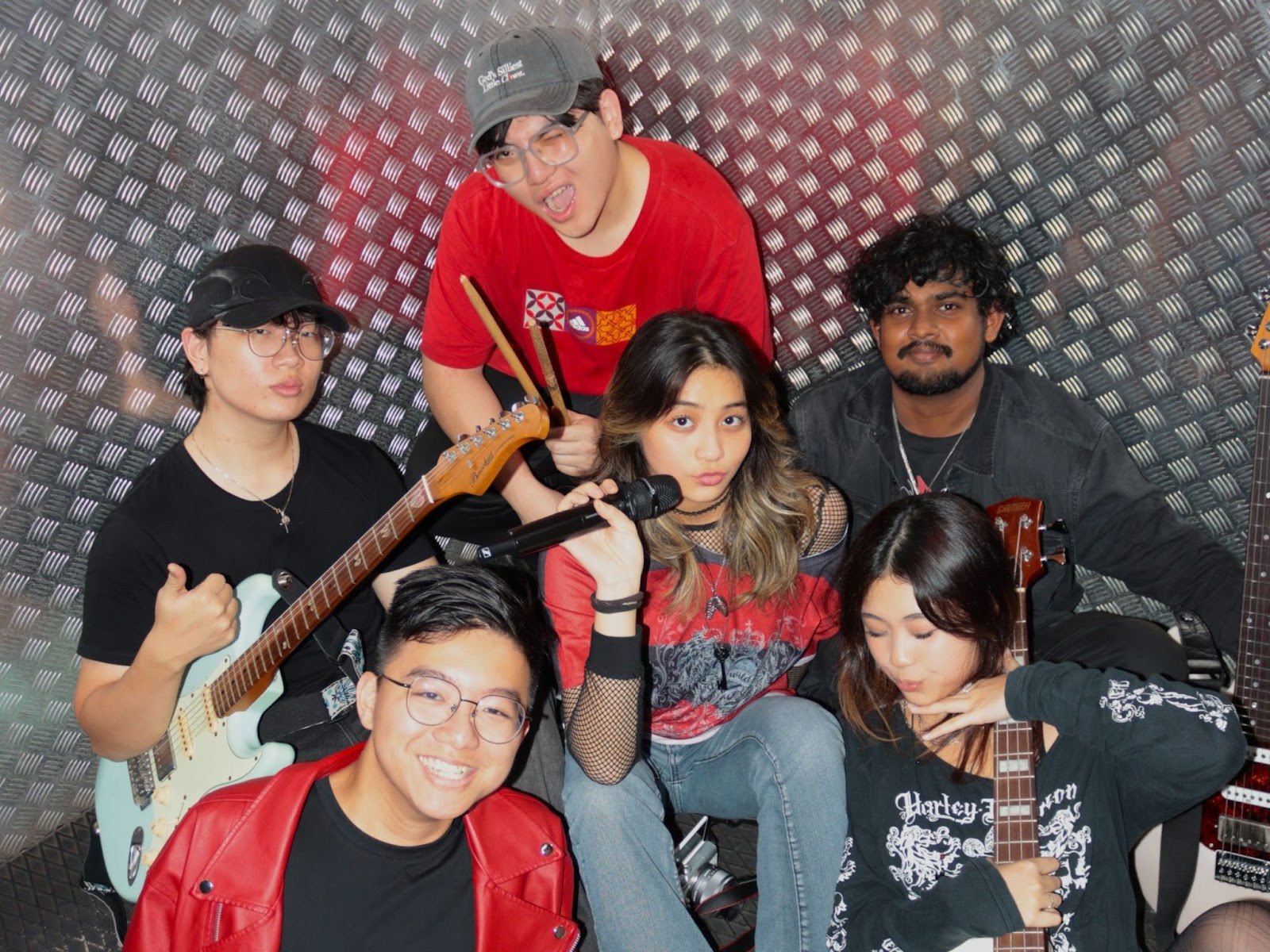 KRIS: It’s a long story. [Our bassist] Kae and I actually met in gymnastics when we were 8 or 9. When I wanted to start a band, I saw her playing bass on her Instagram story and reached out. We hadn’t spoken in years, but she agreed and brought [our guitarist] Ethan along with her. I found [our other guitarist] Pope because we worked at the same place teaching chess to children, and I saw him carrying a guitar around. We found Noah (drummer) through an Instagram story I posted, looking for a drummer. And Wei Kang (keyboardist) actually found us through Battle of the Bands, a competition held by Exfil at Phil’s Studios.